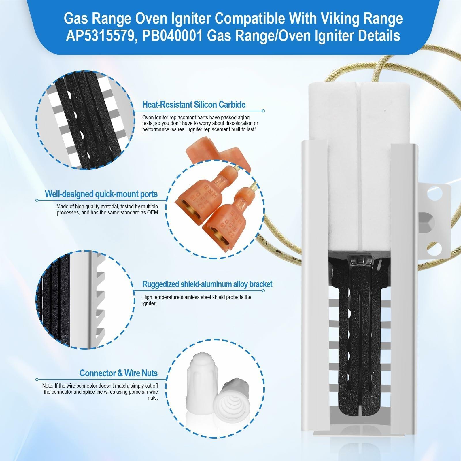 - Oven Igniter Perfect Compatibility and Function: The SGR4001 Fit for viking gas range oven,replace part number: AP5315579 065650-000 SGR4001 792263. Oven igniter replacement can help fix an oven that is not heating due to an igniter failure. If your oven won't heat up or heats up abnormally, you need to replace your old oven igniter to extend the life and maintain the efficiency of your oven.